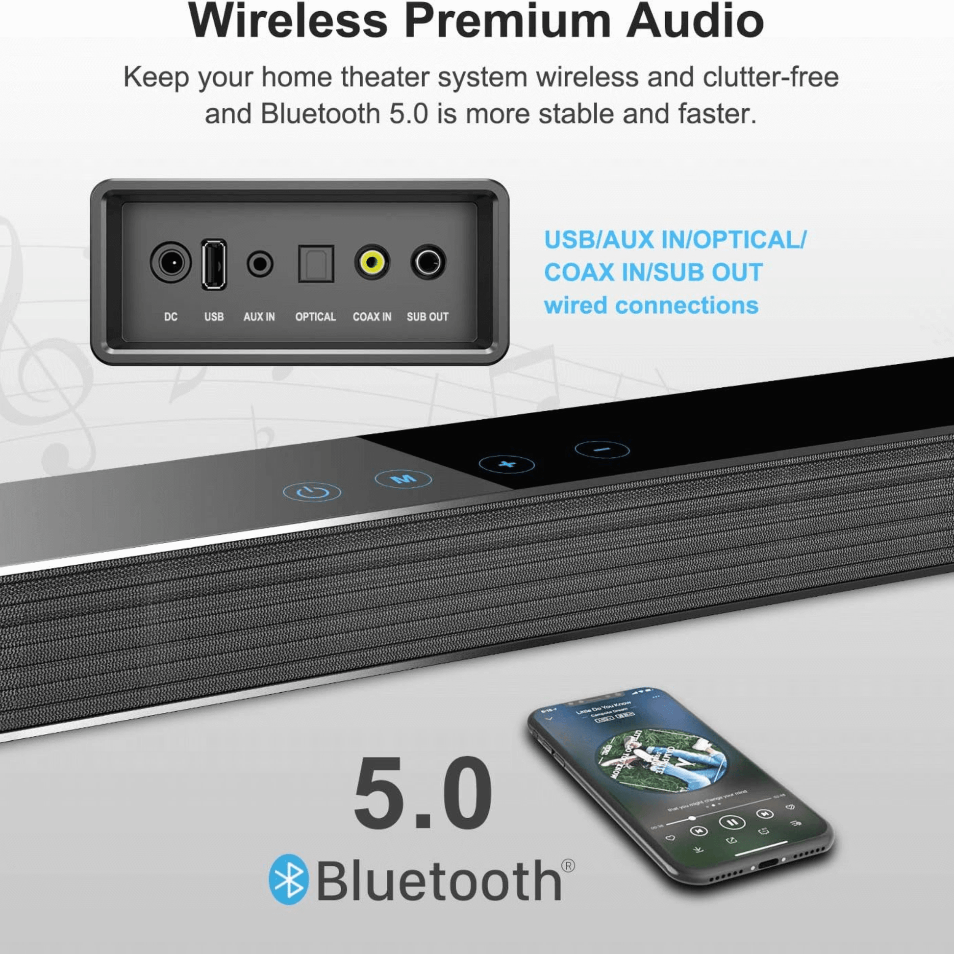 - MULTIPLE INPUTS & 3 SOUND EFFECTS: The Sound Bar System comes equipped with optical, coaxial, AUX, USB, RCA cable, and optical supplies. With its Bluetooth 5.0 connectivity, you enjoy high-quality audio, and it will easily work with devices like flat TVs, computers, tablets, AV receivers, and smartphones. Dialogue, Movie, Music: these three modes are available to help you to adjust the sound to achieve its best quality