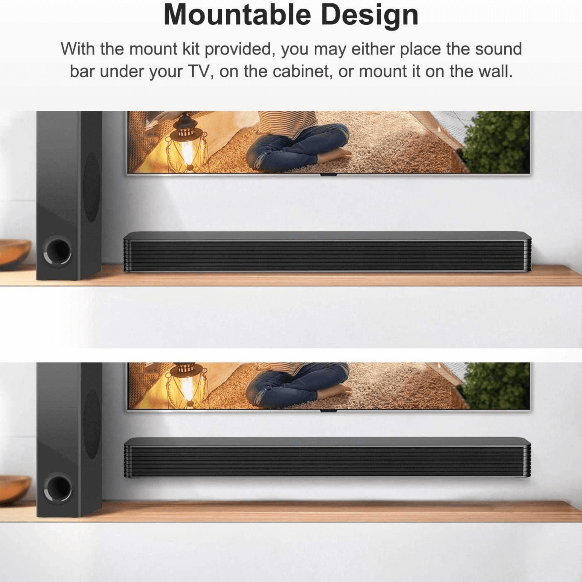 - MINIMUM DESIGN: This 25.5-inch soundbar is a good combination for any 32"+ flat-screen TV. Built-in keyholes make wall mounting easy, or place it on the shelf, on the TV stand, next to the cabinet, or even under the sofa