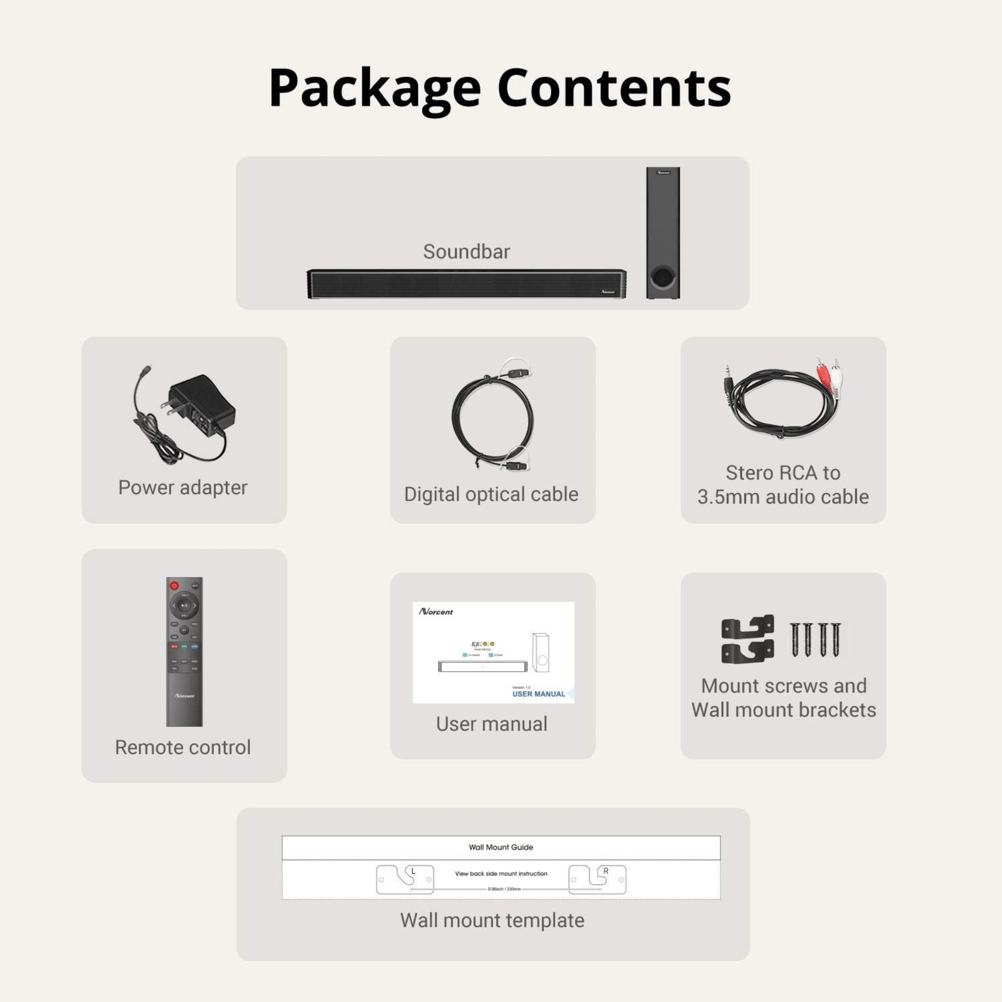 Accessories: Remote Control; User Manual; Power Adapter; Digital Optical Cable; Stereo RCA to 3.5mm Audio Cable; Mount Screws; Wall Mount Brackets; Wall Mount Template